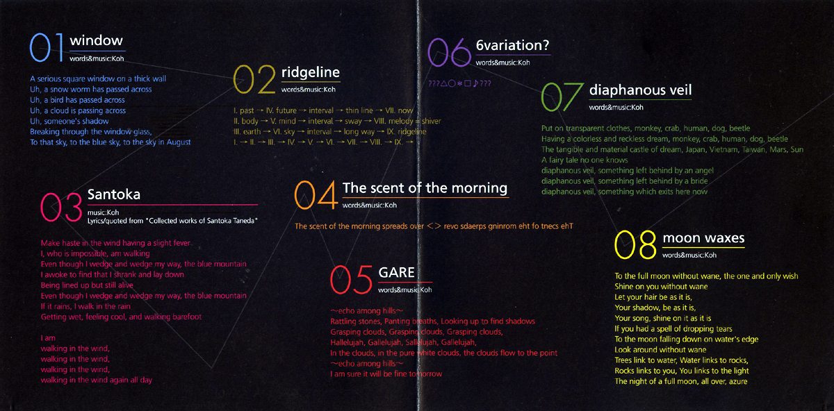 Tracklist: 1. window [7:57] 2. ridgeline [6:16] 3. Santoka [5:49] 4. The scent of the morning [4:51] 5. GARE [12:01] 6. 6variation? [3:19] 7. diaphanous veil [5:34] 8. moon waxes [5:38] 9. signpost [7:45]