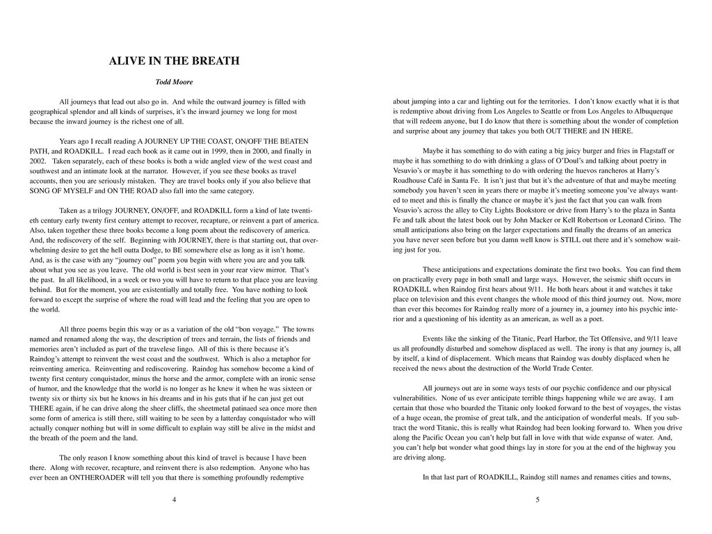 form a kind of late twentieth century early twenty first century attempt to recover, recapture, or reinvent a part of america. Also, taken together these three books become a long poem about the rediscovery of america. And, the rediscovery of the self. Beginning with JOURNEY, there is that starting out, that overwhelming desire to get the hell outta Dodge, to BE somewhere else as long as it isn’t home. And, as is the case with any “journey out” poem you begin with where you are and you talk about what you see as you leave. The old world is best seen in your rear view mirror. That’s the past. In all likelihood, in a week or two you will have to return to that place you are leaving behind. But for the moment, you are existentially and totally free. You have nothing to look forward to except the surprise of where the road will lead and the feeling that you are open to the world. — From the introduction by Todd Moore